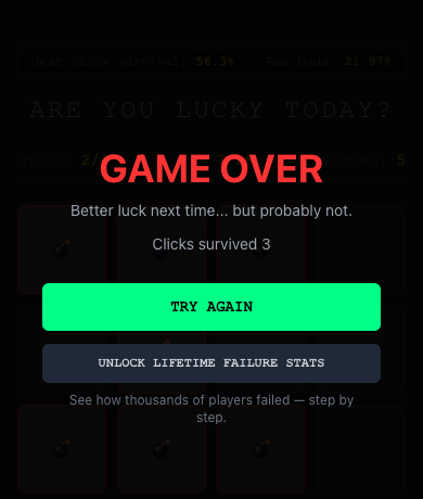 The game is intentionally designed with a 99.409% "house edge" (failure rate) to demonstrate how gambling establishments maintain profitability. Despite appearing "almost winnable," the mathematical reality ensures consistent losses over time.
