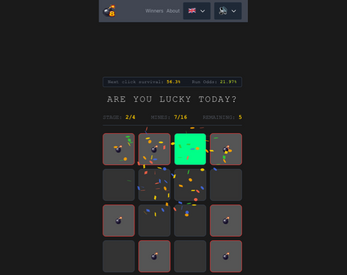 Successfully click 8 safe tiles across 4 progressive stages without hitting any mines. Each stage requires 2 successful clicks before advancing.